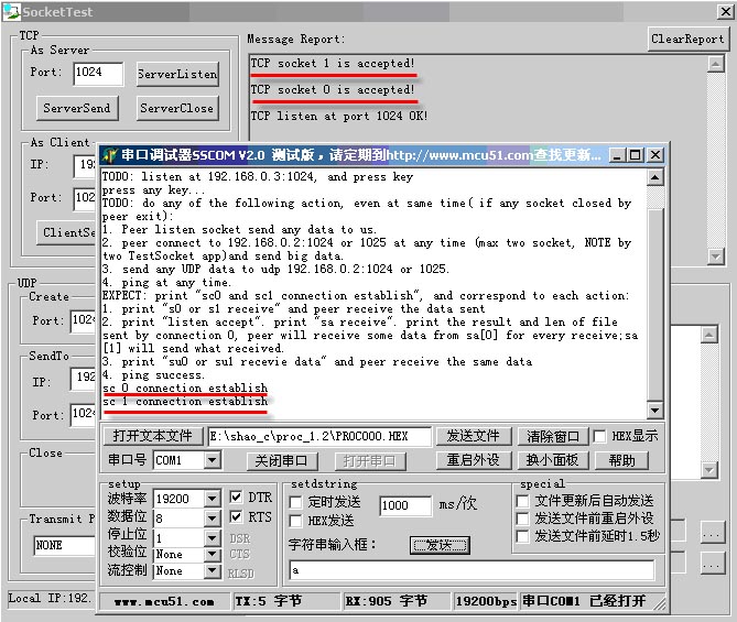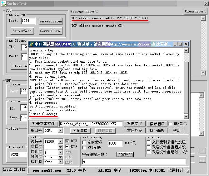 串口和SocketTestDlg提示信息表明開發(fā)板向PC機(jī)發(fā)起了兩個(gè)連接并建立了兩個(gè)連接。