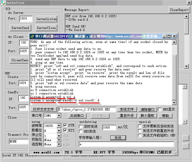 (3) SocketTestDlg創(chuàng)建UDP后,向UDP 192.168.0.2:1024和UDP 192.168.0.2:1025分別發(fā)送“c和發(fā)送“d”字符,串口顯示“su0