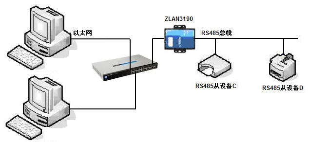 熟悉RS485的用戶都知道,RS485總線上一般只有一個(gè)主機(jī),一般采用主機(jī)輪詢,從機(jī)應(yīng)答的方式。一般難以實(shí)現(xiàn)RS485總線上存在多個(gè)監(jiān)控主機(jī)的方式。但是多主機(jī)監(jiān)控的確實(shí)在某些場合是需要的,卓嵐的ZLAN3190可以實(shí)現(xiàn)該功能??蓪?shí)現(xiàn)100臺(tái)監(jiān)控主機(jī)同時(shí)監(jiān)控。多主機(jī)方式如圖所示。