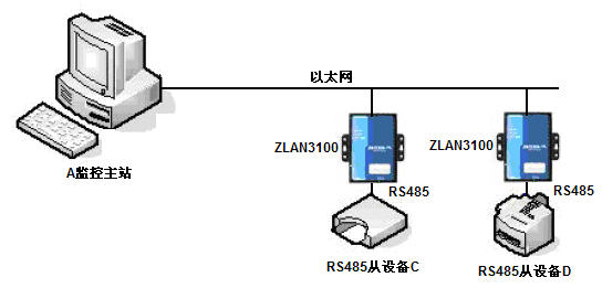 圖3表示的是通常的RS485的系統(tǒng)結(jié)構(gòu),其中包含一臺(tái)監(jiān)控主機(jī)和多臺(tái)RS485設(shè)備,轉(zhuǎn)化為tcp/ip后有兩種方式,分別為圖4的總線結(jié)構(gòu)和圖5的多設(shè)備結(jié)構(gòu)。在總線結(jié)構(gòu)中,系統(tǒng)中和監(jiān)控主機(jī)相連的RS485線被ZLAN3100轉(zhuǎn)換器轉(zhuǎn)化為網(wǎng)線,利用卓嵐ZLVircom驅(qū)動(dòng)可以將該網(wǎng)線虛擬為一個(gè)串口例如COM5。軟件系統(tǒng)和圖3一樣工作;在多設(shè)備結(jié)構(gòu)口中,在離設(shè)備很近的地方將網(wǎng)線轉(zhuǎn)化為RS485,每個(gè)設(shè)備都需要一個(gè)ZLAN3100轉(zhuǎn)換器,ZLVircom支持將兩個(gè)ZLAN3100綁定在一個(gè)虛擬串口上,也就是說系統(tǒng)中有兩個(gè)轉(zhuǎn)換器但是都是對(duì)應(yīng)COM5這一個(gè)虛擬串口,軟件和圖3一樣工作。