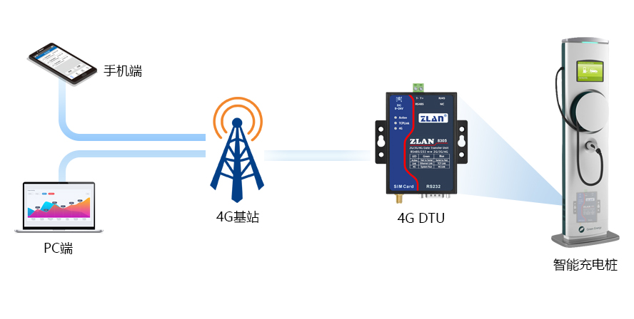 卓嵐4G DTU ZLAN8305/ZLAN8303-7在充電樁數(shù)據(jù)傳輸中的應(yīng)用由充電樁聯(lián)網(wǎng)傳輸由充電服務(wù)管理平臺/手機(jī)app、卓嵐的4G DTU ZLAN8305/ZLAN8303-7 、充電樁組成,充電樁通常是RS232/485接口,通過232/485直接跟卓嵐ZLAN8305/ZLAN8303-7相連,通過4G DTU(加個ZLAN8305超鏈接)的數(shù)據(jù)透傳功能,將充電樁的數(shù)據(jù),通過GPRS/4G網(wǎng)絡(luò)上傳到服務(wù)器,從而實(shí)現(xiàn)充電樁數(shù)據(jù)聯(lián)網(wǎng)。充電樁數(shù)據(jù)管理運(yùn)營企業(yè)可以遠(yuǎn)程實(shí)時監(jiān)控和維護(hù)。工作人員可以通過管理平臺就可以獲取每個充電樁的數(shù)據(jù)信息。