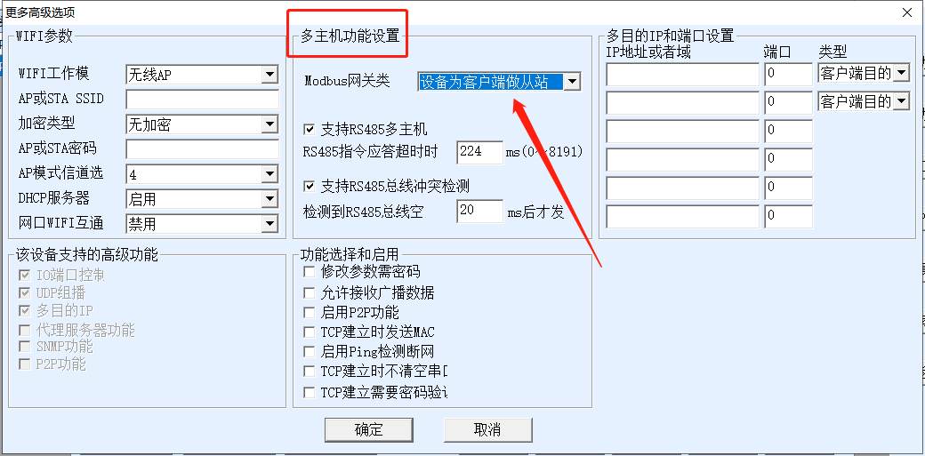 2.點(diǎn)擊更多高級(jí)選項(xiàng)-->在多主機(jī)設(shè)置中,把存儲(chǔ)型網(wǎng)關(guān)改成設(shè)備為客戶端做從站(串口服務(wù)器擬定網(wǎng)口風(fēng)機(jī)從站地址為風(fēng)機(jī)IP地址的最后一位,此刻風(fēng)機(jī)IP是192.168.1.50.風(fēng)機(jī)從站地址就是50)。