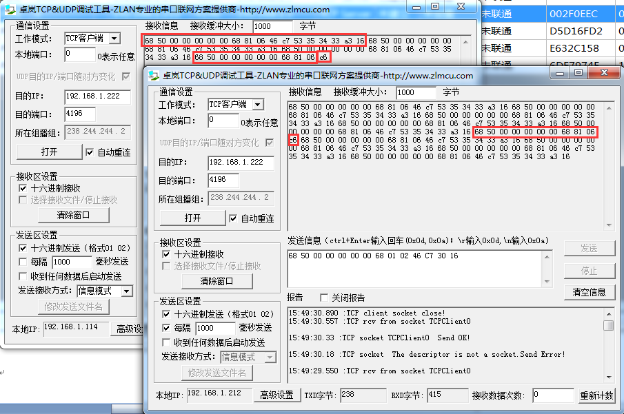 我們使用兩個SocketDlgTest工具連接上5143,不斷同時發(fā)送645的協(xié)議指令68 50 00 00 00 00 00 68 01 02 46 C7 30 16,如圖所示本來為:68 50 00 00 00 00 00 68 81 06 46 c7 53 35 34 33 a3 16的指令沖突后變?yōu)?8 50 00 00 00 00 00 68 81 06 c6。也就是出現(xiàn)丟失和誤碼。另外只有一個SocketDlgTest發(fā)送時,在數(shù)據(jù)返回的時候兩個SocketDlgTest窗口都收到數(shù)據(jù),這樣也不符合要求。應(yīng)該是不發(fā)送數(shù)據(jù)的窗口不收到任何返回。