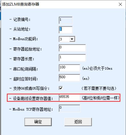 這個離線只要求高字節(jié)和低字節(jié)一樣,即可以設(shè)置:v*256+v,其中v≤255且v>=0。 只有第一條記錄的設(shè)置值是有效的,其它記錄仿造第一條記錄的參數(shù)。這里只看第一條記錄的參數(shù)還包括:串口輪詢間隔、超時應(yīng)答時間、支持06或者05寫指令。