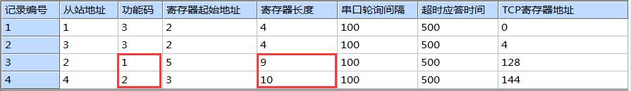| 記錄編號 | 從站地址 | 功能碼 | 寄存器地址 | 長度 |