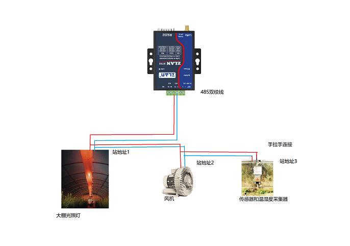 1.大棚端將lora網(wǎng)關(guān)通過485雙絞線和大棚內(nèi)的485串口儀表,采集器和風(fēng)機(jī)等設(shè)備手拉手連接。