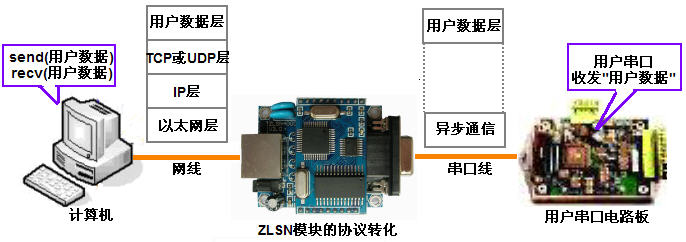 通信協(xié)議是一種分層結(jié)構(gòu)的,根據(jù)ISO的7層模型通信協(xié)議分為物理層、數(shù)據(jù)鏈路層、網(wǎng)絡(luò)層、傳輸層、會(huì)話層、表示層、應(yīng)用層。如果用戶想通過(guò)卓嵐ZLSN模塊的以太網(wǎng)透明傳輸協(xié)議實(shí)現(xiàn)串口數(shù)據(jù)和以太網(wǎng)數(shù)據(jù)的轉(zhuǎn)發(fā),應(yīng)用模型如圖所示。