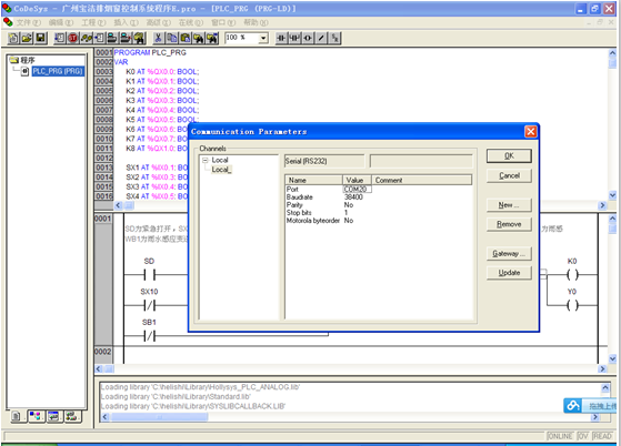 此處基于和利時LM3108,將卓嵐串口服務器和LM3108進行硬件上的連接,通過在遠端服務器上虛擬串口,然后通過PowerPro和虛擬出來的COM20進行通訊,實現PLC的遠程下載和控制,軟件界面如圖所示。