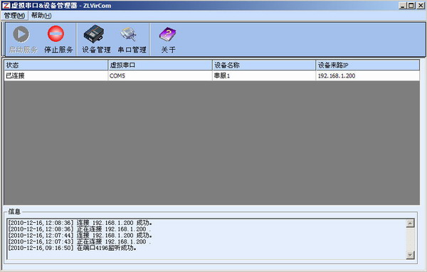 綁定虛擬串口:既然虛擬串口已經(jīng)可以使用了,那么那com5的輸出在哪里?輸入又來(lái)自哪里?這就需要綁定了。進(jìn)入ZLVircom的“設(shè)備管理”,從中選擇一臺(tái)NETCOM2000串口服務(wù)器(例如“串服1”),然后進(jìn)入該設(shè)備的編輯,即可選擇和這臺(tái)NETCOM2000綁定的虛擬串口,這里選擇COM5。之后在ZLVircon的主界面就出現(xiàn)了一條記錄,表示虛擬串口COM5實(shí)際就等價(jià)于“串服1”這臺(tái)NETCOM2000設(shè)備上的硬件串口。
