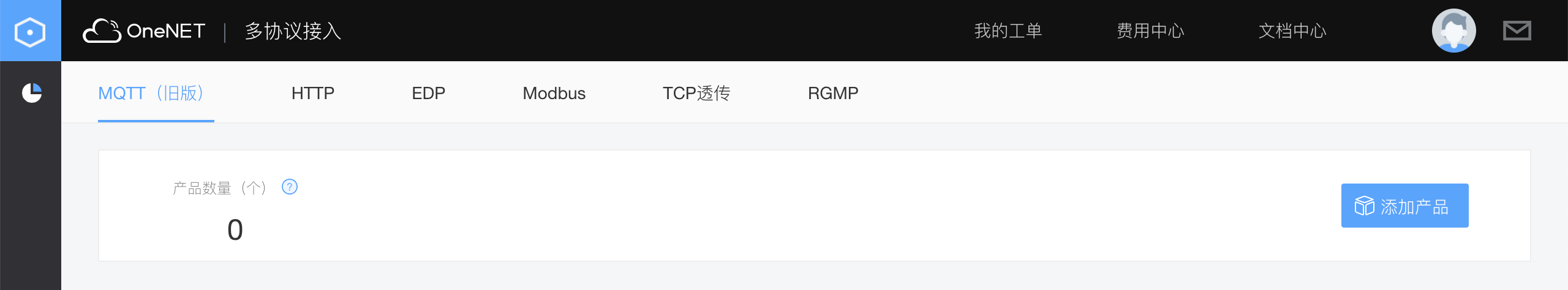 請(qǐng)登錄https://open.iot.10086.cn/,注冊(cè)O(shè)neNET賬號(hào)。注冊(cè)過程比較簡(jiǎn)單這里就不再累述。登錄后進(jìn)入開發(fā)者中心,點(diǎn)擊左上角全部產(chǎn)品,全部產(chǎn)品多協(xié)議接入MQTT(舊版)。然后點(diǎn)擊“添加產(chǎn)品”。