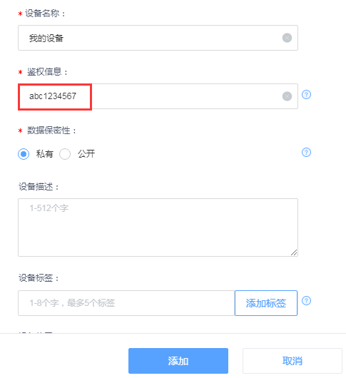 提示添加設(shè)備(后面也可以通過點(diǎn)擊產(chǎn)品設(shè)備列表添加設(shè)備來增加設(shè)備)。這里添加一個(gè)“我的設(shè)備”這樣的設(shè)備。這里的“鑒權(quán)信息”是后面設(shè)備連接時(shí)用到的,鑒權(quán)信息是自己輸入的隨意的密碼。