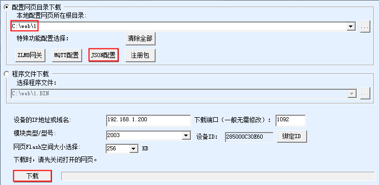 進(jìn)入之前第一節(jié)的ZLVircom的“JOSN轉(zhuǎn)Modbus配置”主界面,這里點(diǎn)擊“JSON下發(fā)”按鈕。