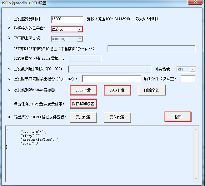 云平臺(tái)選擇“卓嵐云”。然后點(diǎn)擊“JSON上發(fā)”進(jìn)入下面的JSON上發(fā)配置。返回后需要點(diǎn)擊“保存JSON設(shè)置”和“返回”。