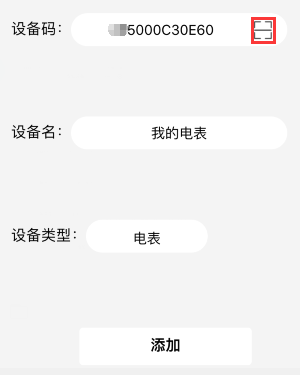 這里設(shè)備類(lèi)型已經(jīng)自動(dòng)選擇了剛剛添加的“電表”類(lèi)型。點(diǎn)擊設(shè)備碼右邊的[-]按鈕,掃描上一節(jié)中“設(shè)備參數(shù)設(shè)置”中按[-]按鈕彈出的二維碼輸入ID。設(shè)備名稱(chēng)可以任意取,比如“我的電表”。