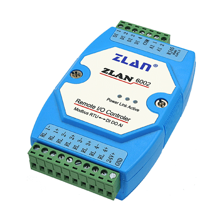 ZLAN6002主要為RS485進行遠程數字量、模擬量的輸入輸出設計的。設備兼容Modbus RTU協(xié)議,可以和組態(tài)軟件、PLC等無縫連接。4路繼電器具有5A@AC250V/DC30V特性,可以驅動大電流設備;4路DI數字量輸入可以為干接點或者濕節(jié)點;2路AI輸入可以為電流量、電壓量、電阻類型的溫濕度傳感器等。