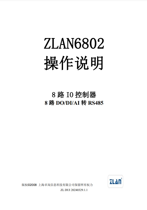 ZLAN6842、ZLAN6802、ZLAN6844是繼ZLAN6042之后上海卓嵐信息科技有限公司推出的8路遠(yuǎn)程IO控制器。其控制的路數(shù)從6042 的4路擴(kuò)展到8路,含有8路DI、8路DO,8路AI輸入。其中DI支持干節(jié)點(diǎn)和濕節(jié)點(diǎn),帶光耦隔離;DO為繼電器輸出,具有5A 250VAC或5A 30VDC的控制能力;AI輸入中的前4路支持0~5V電壓量輸入,后4路支持4~20mA電流量輸入,精度10位。ZLAN6842、ZLAN6802、ZLAN6844分別支持以太網(wǎng)、RS485、Wifi這3種形式的通信方式。