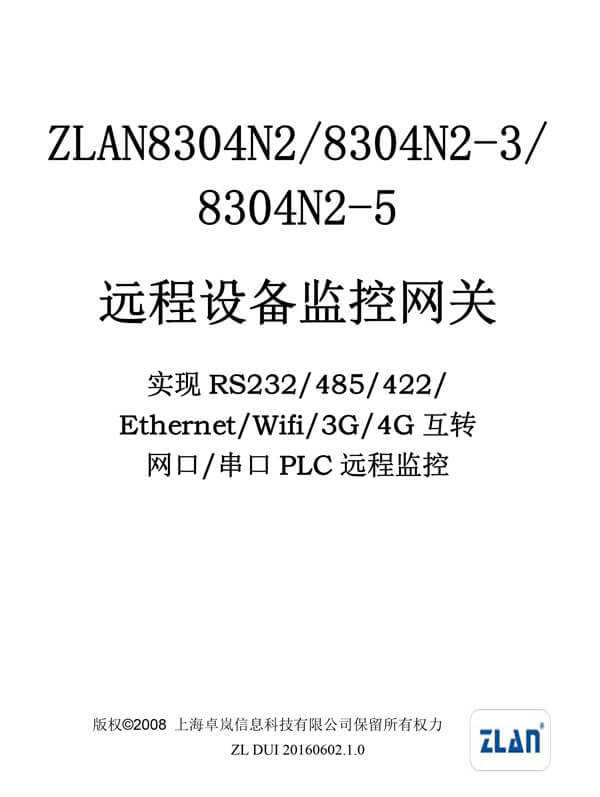 選擇型號:ZLAN8304分為3個子型號:ZLAN8304N2-5、ZLAN8304N2-3、ZLAN8304N2,3種型號都支持P2P、N2N、Modbus功能。ZLAN8304N2-5,-5表示支持電信、聯(lián)通和移動卡的3G/4G型號,包含8304N2所有功能。ZLAN8304N2-3,-3表示只支持電信的3G型號,包含8304N2所有功能。ZLAN8304N2,不支持3G/4G,Wifi或者以太網(wǎng)接入網(wǎng)絡(luò)。