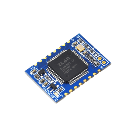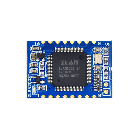 2003T的尾綴T表示采用的是郵票孔的接口,2003T只有單面有元器件,所以可以貼到用戶電路板上,適合SMT工藝集成到用戶電路板。雖然另外一種模塊ZLSN2003S具有更小的體積,但是2003S是雙排針模塊,不適合貼到電路板表面。