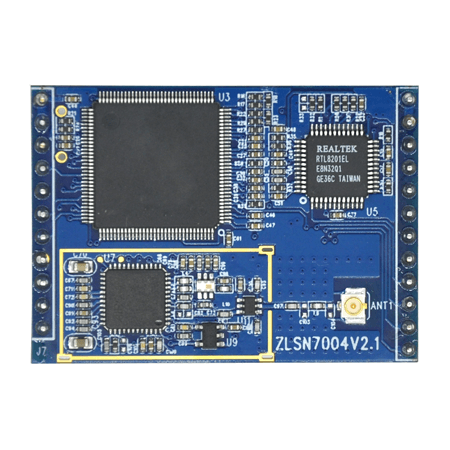 7004采用11針+12針雙排針結(jié)構(gòu),外形兼容ZLSN2002,電壓供電是3.3V。串口通過3針UART的RXD、TXD、GND連接用戶設(shè)備的TTL電平串口,另外一端通過wifi或者以太網(wǎng)進(jìn)行連接。wifi支持STA模式連接到無線路由器,或者作為AP模式讓手機(jī)等wifi設(shè)備連接。模塊上不含有網(wǎng)絡(luò)變壓器,用戶可以用含有網(wǎng)絡(luò)變壓器的RJ45直接和模塊的以太網(wǎng)接口連接。