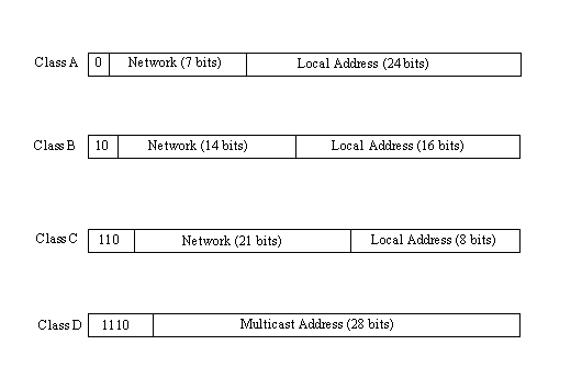 Class A for large networks: Network address is 7 bits, local address is 24 bits. Class B for midsize networks: Network address is 14 bits, local address is 16 bits. Class C for small networks: Network address is 21 bits, local address is 8 bits. Class D for multicast addresses, using 28 bits. Class D networks are seldom encountered.