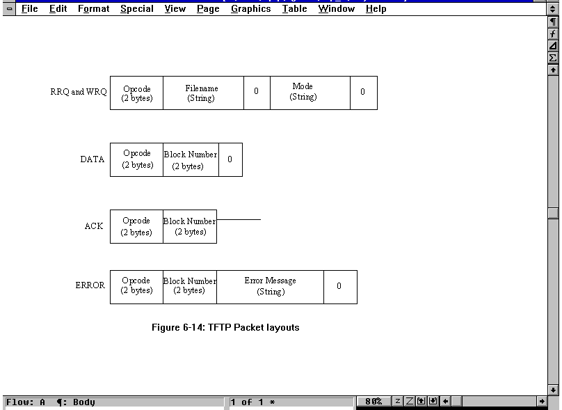 TFTP uses five types of Protocol Data Units, which are referred to as packets in the TFTP lexicon. These packets are listed in Table 6.8. Their layout is shown in Figure 6.14. Error messages supported by TFTP are shown in Table 6.9.