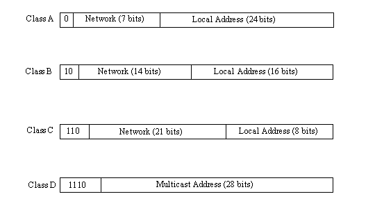 The IP addresses are assigned by the NIC based on the class of network, which reflects the size of the organization and the number of local equipment addresses required. As shown in Figure 13.6, there are four NIC-approved IP address structures. Class A addresses are for very large networks that need 24 bits available for local addresses, reducing the network address to 7 bits. Class B assigns 16 bits locally and 14 bits for the network address, whereas Class C enables only 8 bits for local addresses and 21 bits for the network address. Class C networks are for small companies only, because only 256 local addresses can be created. Class D addresses are used for special systems not usually encountered by users.